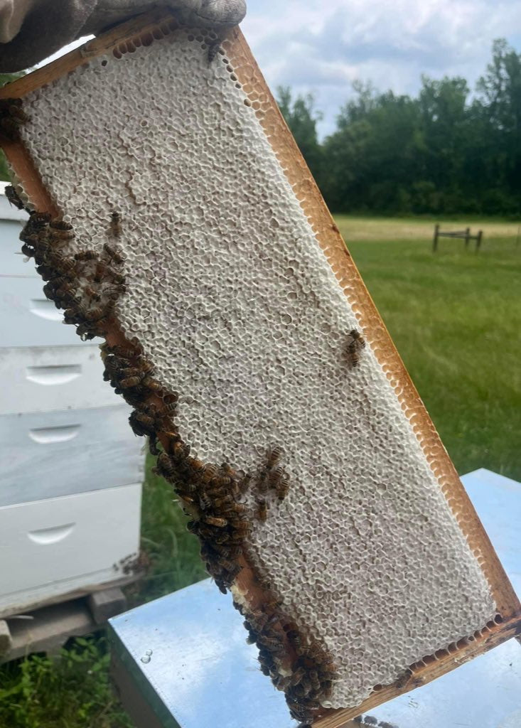 The honey comes from wild nectar sources on my land. Old pasture, woods, and fence lines. No monocrops nearby. No heavy spray drift.